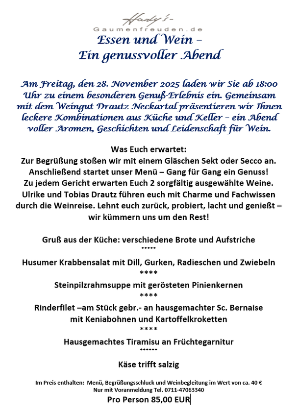 Ab 18:00 Uhr erwartet Sie ein mehrgängiges Menü, bei dem jeder Gang von passendem Wein begleitet wird. Gemeinsam mit dem Weingut Drautz präsentieren wir Ihnen leckere Kombinationen aus Küche und Keller – ein Abend voller Aromen, Geschichten und Leidenschaft für Wein.